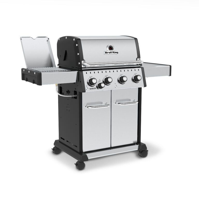 Baron™ S 440 PRO IR features 460 sq. in. primary cooking surface and includes a durable cast aluminum oven, 4 stainless steel Dual-Tube™ burners, illuminated control panel lights, stainless steel 8mm rod cooking grids, stainless steel warming rack, stainless steel Flav-R-Wave™ cooking system, and electronic ignition. The S 440 PRO IR Series features a powerful infrared side burner with solid stainless steel 8mm rod cooking grid and stainless steel drop-down side shelves.