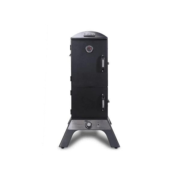 Le fumoir à propane liquide vertical de 14 000 BTU est doté de 770 pouces carrés d'espace de cuisson total, de quatre grilles de cuisson réglables en acier inxydable, d'un système d'allumage électronique Sure-Lite Mc, d'un système de clapet réglable en aluminium moulé Roto-Draft MC et de deux portes en acier robuste avec système de loquet de joint de qualité.